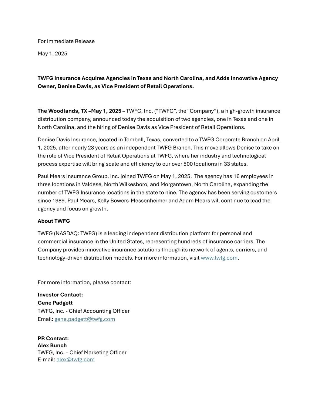 For Immediate Release May 1, 2025 TWFG Insurance Acquires Agencies in Texas and North Carolina, and Adds Innovative Agency Owner, Denise Davis, as Vice President of Retail Operations. The Woodlands, TX –May 1, 2025 – TWFG, Inc. (“TWFG”, the “Company”), a high-growth insurance distribution company, announced today the acquisition of two agencies, one in Texas and one in North Carolina, and the hiring of Denise Davis as Vice President of Retail Operations. Denise Davis Insurance, located in Tomball, Texas, converted to a TWFG Corporate Branch on April 1, 2025, after nearly 23 years as an independent TWFG Branch. This move allows Denise to take on the role of Vice President of Retail Operations at TWFG, where her industry and technological process expertise will bring scale and efficiency to our over 500 locations in 33 states. Paul Mears Insurance Group, Inc. joined TWFG on May 1, 2025. The agency has 16 employees in three locations in Valdese, North Wilkesboro, and Morgantown, North Carolina, expanding the number of TWFG Insurance locations in the state to nine. The agency has been serving customers since 1989. Paul Mears, Kelly Bowers-Messenheimer and Adam Mears will continue to lead the agency and focus on growth. About TWFG TWFG (NASDAQ: TWFG) is a leading independent distribution platform for personal and commercial insurance in the United States, representing hundreds of insurance carriers. The Company provides innovative insurance solutions through its network of agents, carriers, and technology-driven distribution models. For more information, visit www.twfg.com. For more information, please contact: Investor Contact: Gene Padgett TWFG, Inc. - Chief Accounting Officer Email: gene.padgett@twfg.com PR Contact: Alex Bunch TWFG, Inc. – Chief Marketing Officer E-mail: alex@twfg.com